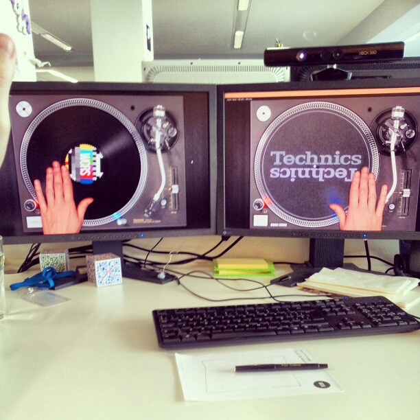 To achieve this, I made a Kinect and OpenFrameworks driven turntable music experiment. The hand tracking was coded using the OpenNI library. It could track both hands and detect the up and down movement to trigger the scratching mode or the circular movement on top of the vinyl to increase or decrease the playing speed.